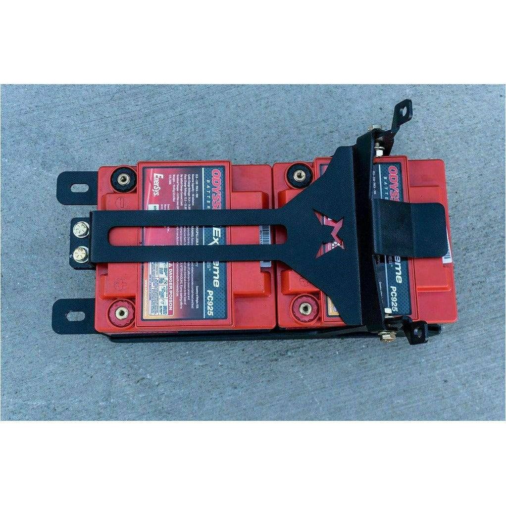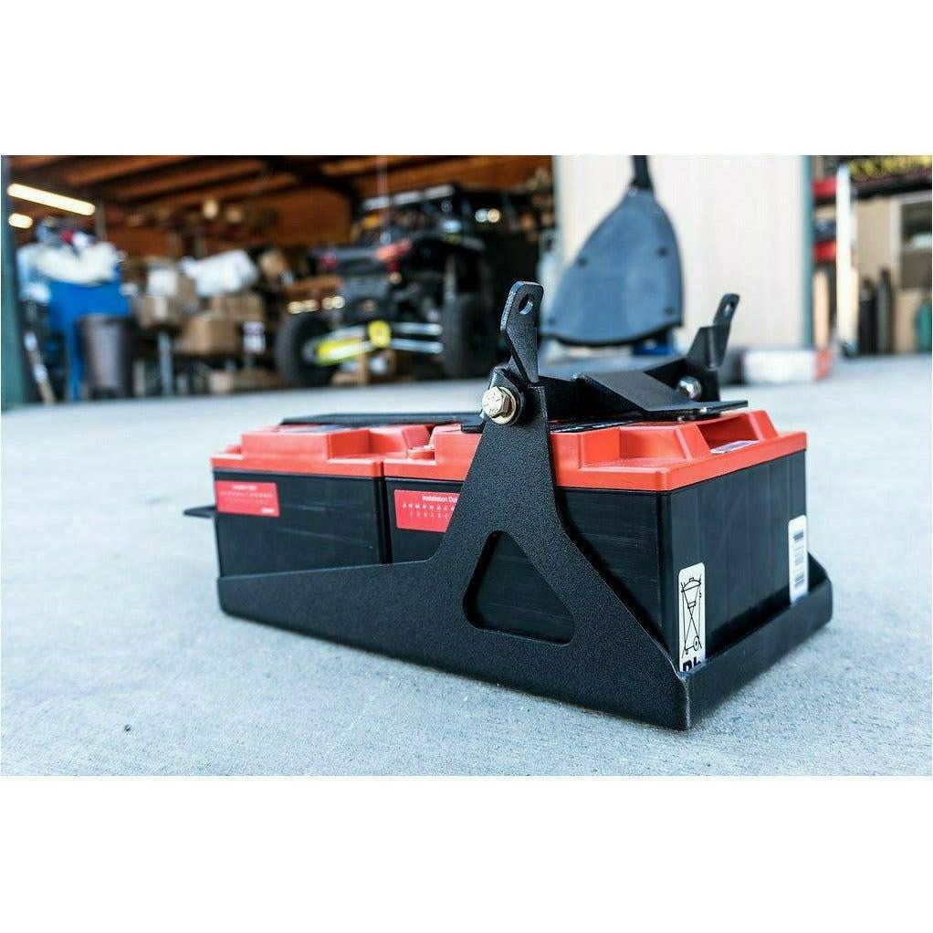 Madigan Motorsports Dual Battery Mount for the Can-Am X3 Max. Our Battery Mount fits 2 Odyssey 925 Batteries. It features a compact 1/8 inch Steel box that mounts under the rear passenger seat to help power additional accessories that the factory battery cant. Available in only Raw or Black.