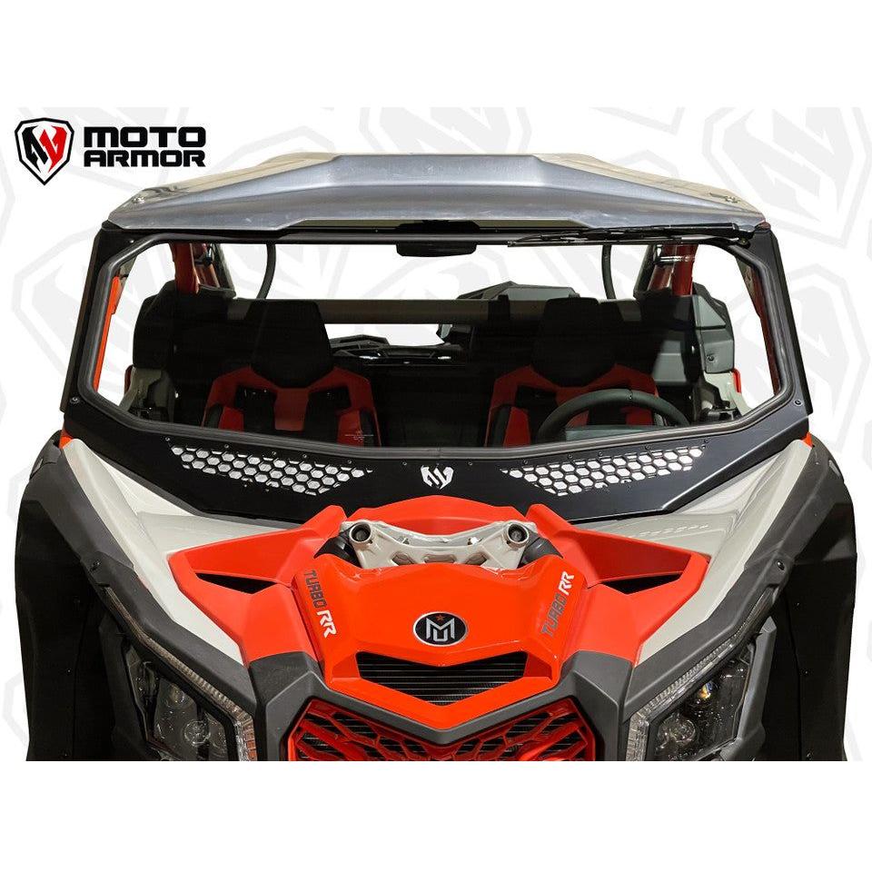 Moto Armor Can Am X3 Glass Windshield now features wider and taller glass than ever before. Honeycomb vent design not only looks great, but can open to allow airflow to help keep cool and keep the dust down. Dark tinted poly carb visor helps to increase the viewing area up top. Two pre-cut holes for manual windshield wipers, (one included).