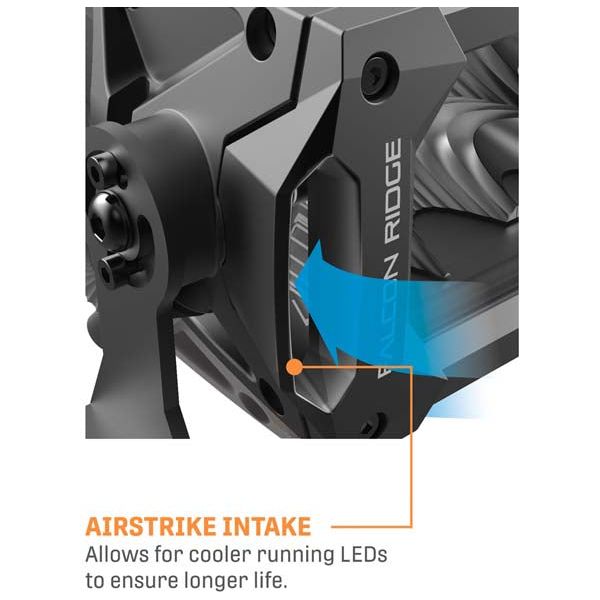 With industry leading features like IP68 rated housing, 304 Stainless Steel hardware, heavy-duty mounting brackets and shatter resistant lenses, the Falcon Ridge Summit Series LED lights are ready for whatever conditions arise. Falcon Ridge takes it to the next level with the Airstrike Intake and military-style breathers to help the lights maintain optimal operating temperatures. The IP67 rated backlit switch with solid aluminum housing fits standard knockouts, so it will seamlessly integrate into your dash control panel.