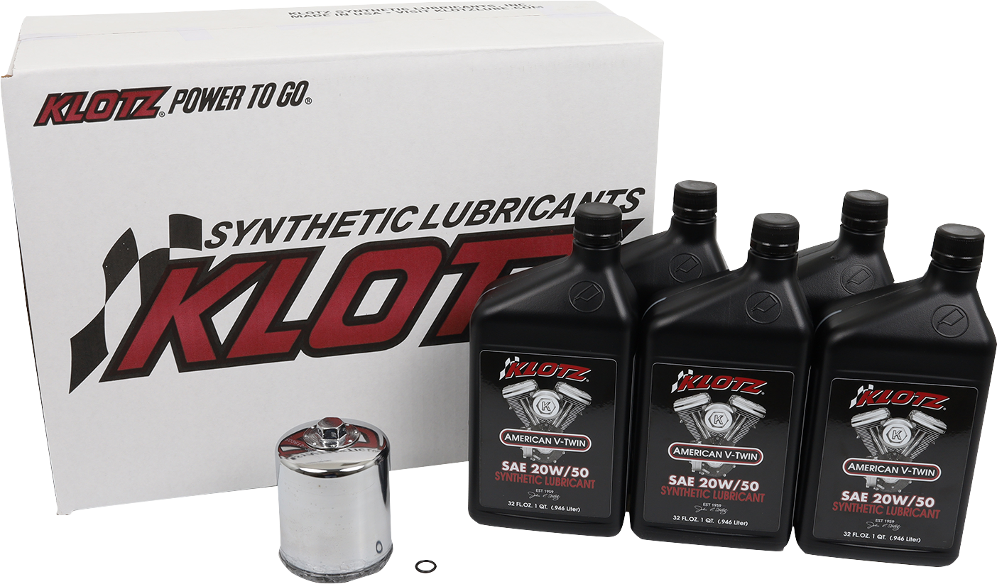 Klotz® V-Twin Oil Change Kits come with just the right amount of lubricant, no more no less, Formulations are optimized specifically for Harley-Davidson® hardware, High-quality base oils and polymers maintain shear stability under harsh or extended operation conditions, Friction modifying chemistry increases power and efficiency while reducing operating temperatures, Detergents and dispersants maintain cleanliness and mitigate deposit formation, Top-tier additive package prevents wear, oxidation and corrosion