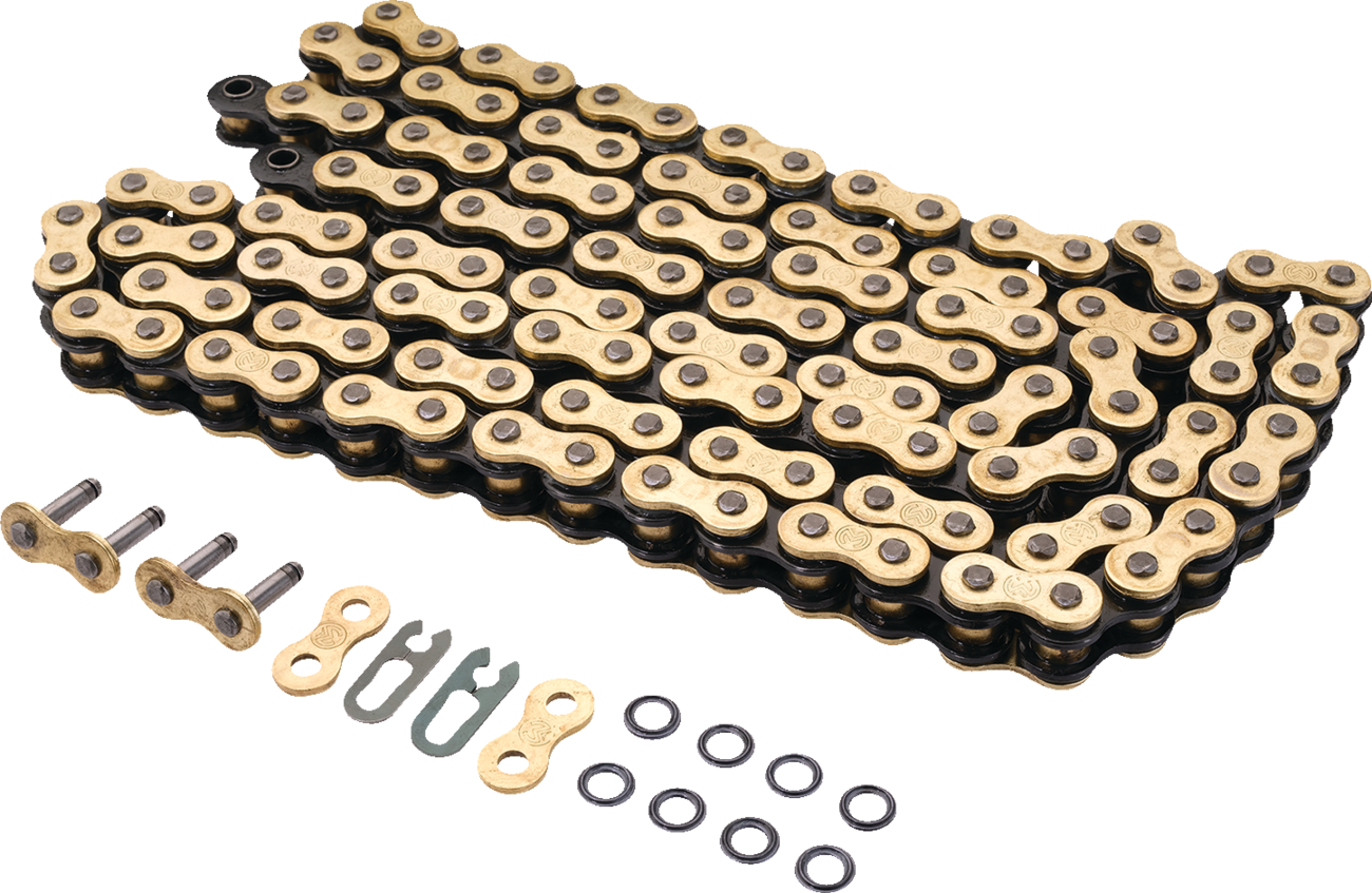 Uses O shaped self lubricating seal allowing constant lubrication, Extra high-tensile strength link plates , Rust-resistant nickel-plated gold colored side plates, Gold inner and outer links, Solid roller inner link and inner bushing, Clip-type connecting link included