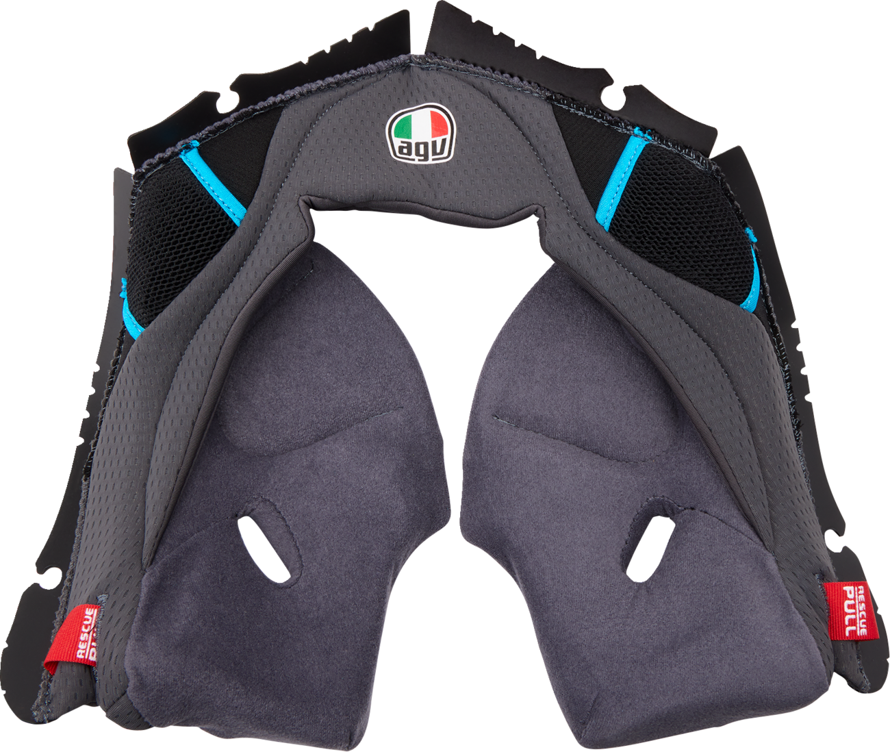 Upgrade your AGV Pista GP RR helmet with these genuine AGV Pista GP RR Cheek Pads, designed specifically for optimal comfort and fit. Crafted by AGV, part number 201850005623G2X, these replacement cheek pads are compatible with AGV Pista GP RR helmets to ensure a perfect fit and maintain the helmet's high-performance standards. The gray and cyan color scheme provides a sleek and modern appearance that complements your helmet’s design. These cheek pads are essential for restoring the helmet's comfort and structural integrity after extended use or maintenance.