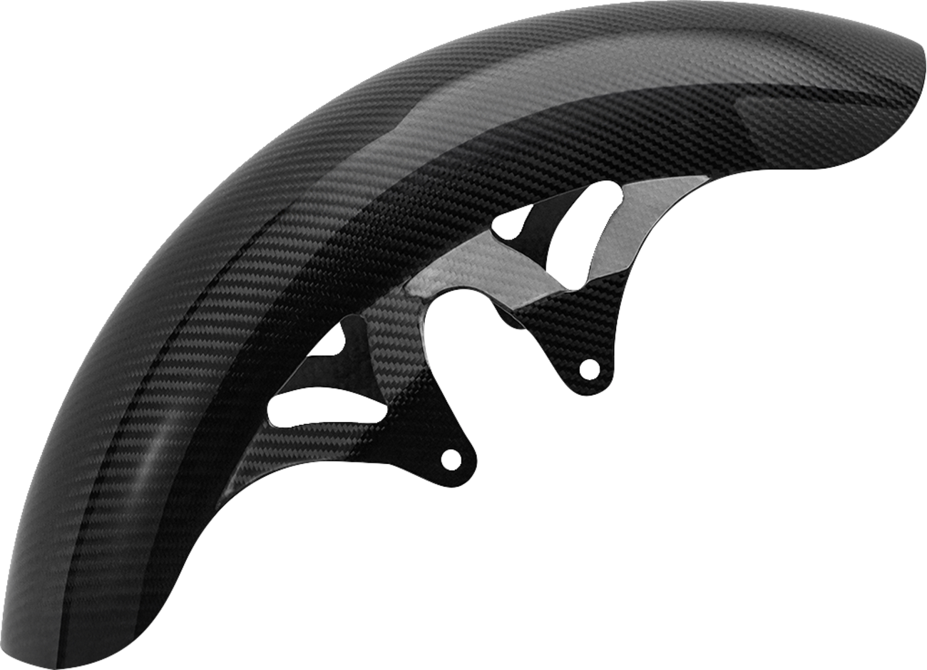 19” Carbon fiber front fender featuring a short length and custom double window design, Made from premium pre-preg carbon fiber with CNC machined billet aluminum molds, High gloss, UV-resistant clear coat for long term durability , Engineered to allow clearance for up to 14" oversized brake rotors , Direct bolt-on fitment, does not require additional brackets, Allows clearance for up to 14” oversized brake rotors, Accepts all 130/60-19” width front tires, Works with factory and most all aftermarket fork legs