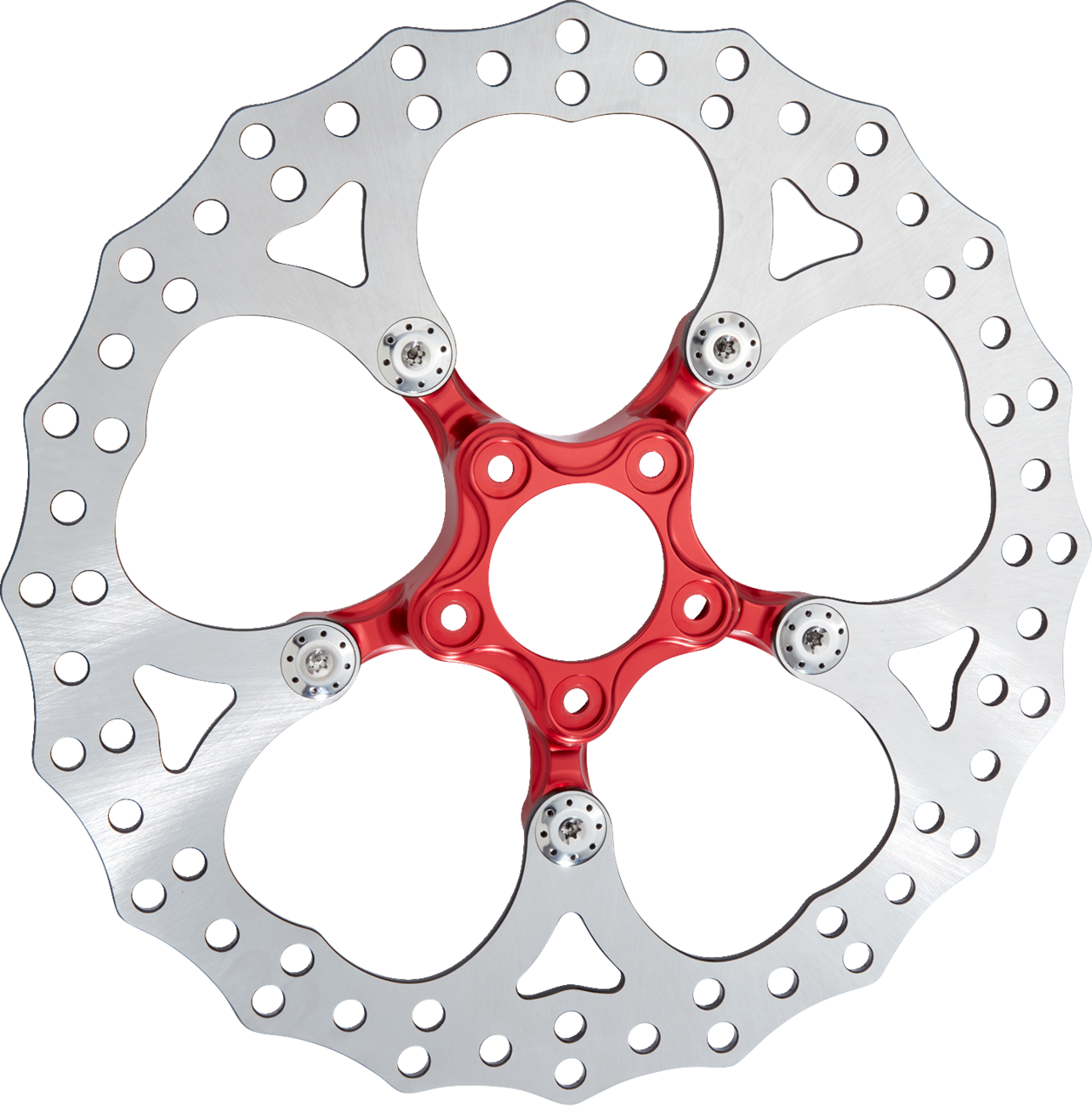 Spider performance brake rotors feature titanium floating rotor hardware, jagged brake discs & CNC machined lightweight billet carriers , Outer brake disc is made from high carbon 420 stainless steel, laser cut then CNC machined to remove all hard edges for a smooth feel, Floating rotor hardware is CNC machined from solid Titanium, Arlen Ness hub kit required to complete wheel on ABS or non-ABS Harley applications.