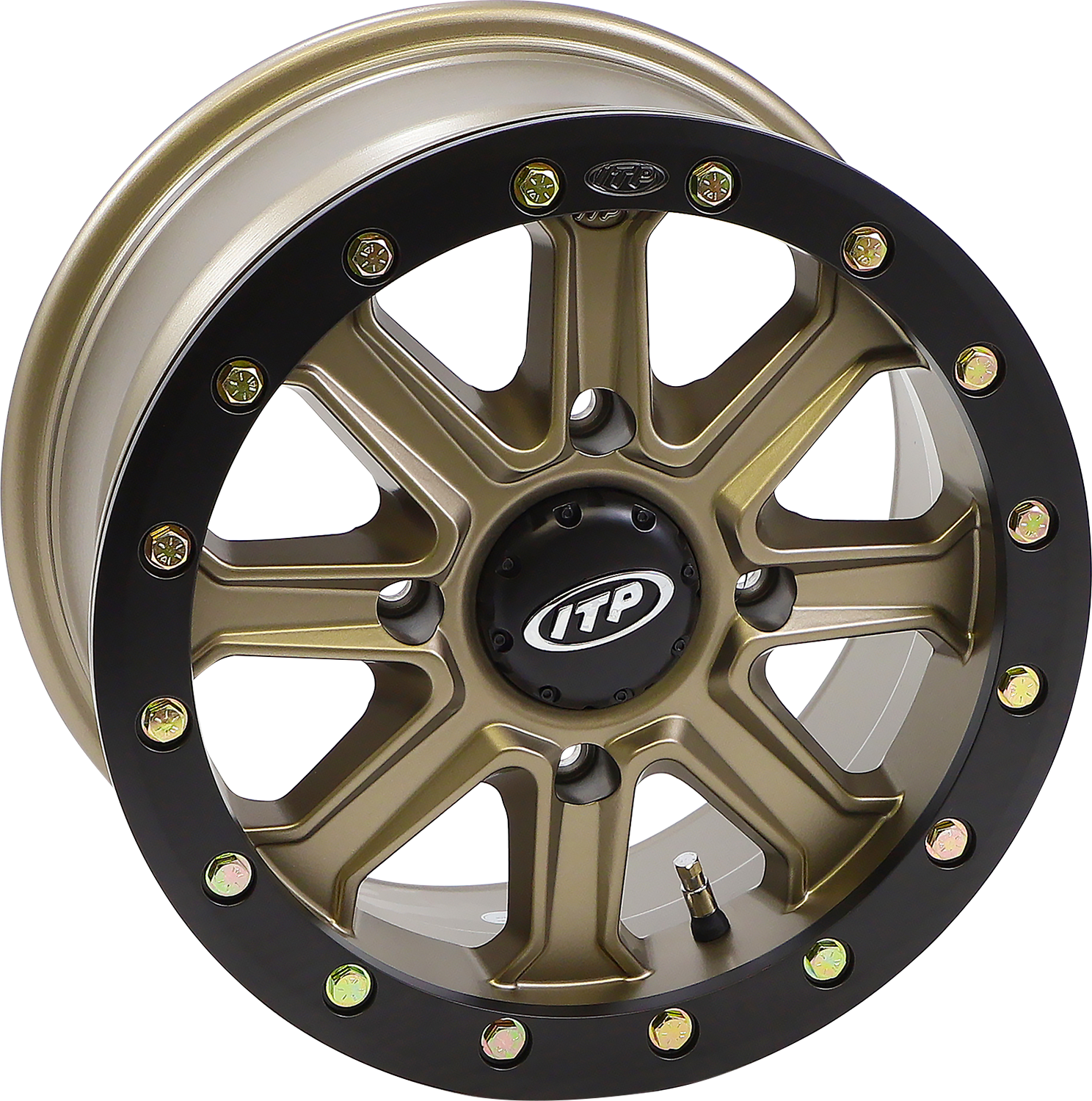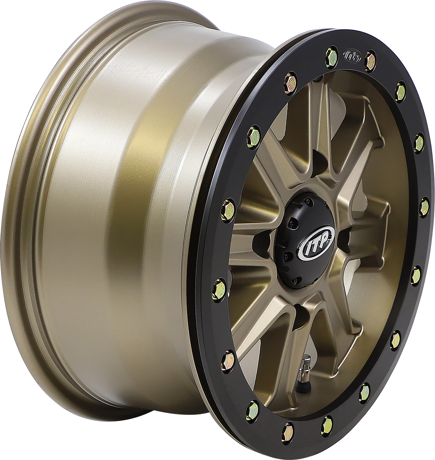 Beadlock design insures outer bead stays seated in demanding environments, Closer to OE offsets for optimum fitment and performance, ITP Exclusive "Rock Armor" inner wheel lip, Matte black finish with machined edges, Center cap and valve stem included