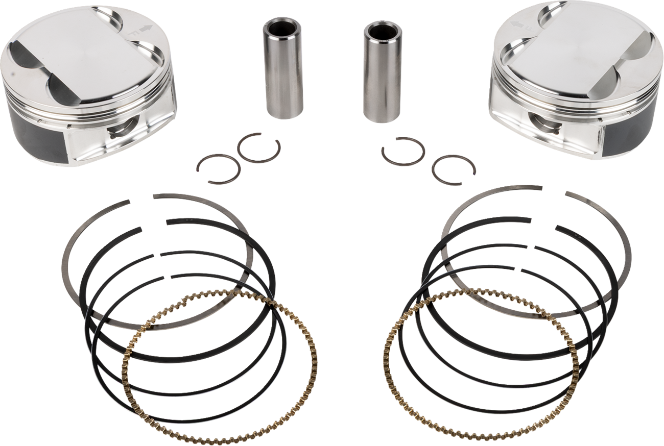 2618-T6 forged construction provides better aligned grain flow and higher tensile strength to provide durability, even in high-performance builds, Skirt coating reduces opertating friction and wear , Offset pins reduce piston rock and minimize operating noise, Skirt notches for optimal clearance at bottom dead center, Accumulator groove taps combustion gases below the top ring to promote more consistent, positive ring seal and performance, Inlcudes two pistons, premium ring packs, wrist pins and wire locks