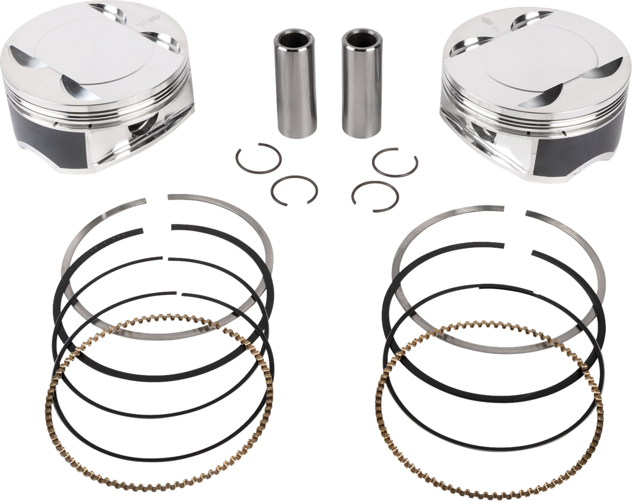 2618-T6 forged construction provides better aligned grain flow and higher tensile strength to provide durability, even in high-performance builds, Skirt coating reduces opertating friction and wear , Offset pins reduce piston rock and minimize operating noise, Skirt notches for optimal clearance at bottom dead center, Accumulator groove taps combustion gases below the top ring to promote more consistent, positive ring seal and performance, Inlcudes two pistons, premium ring packs, wrist pins and wire locks