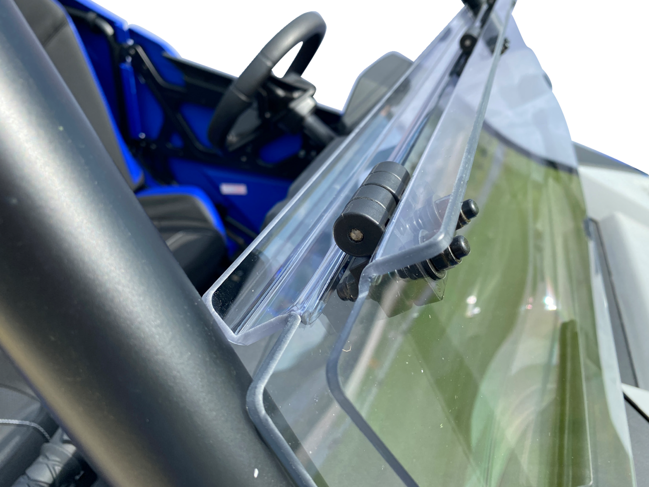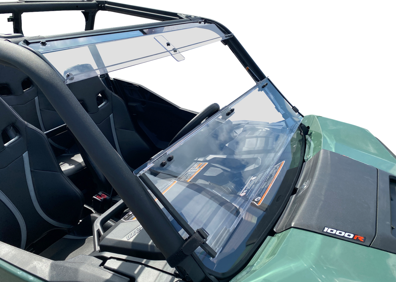 - Top of folding section connects to roll cage via hook-and-loop straps for quick adjustment