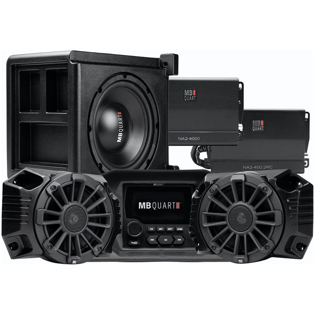 Polaris RANGER 2018-Current UTV Tuned Audio Package: Three Speaker 800 Watt STAGE 3 Audio System includes AM/FM, BT LED Source Unit controlling two amplifiers powering 2 coaxial speakers, 10 inch subwoofer in a sealed enclosure. All necessary mounting panels and harnessing are included.