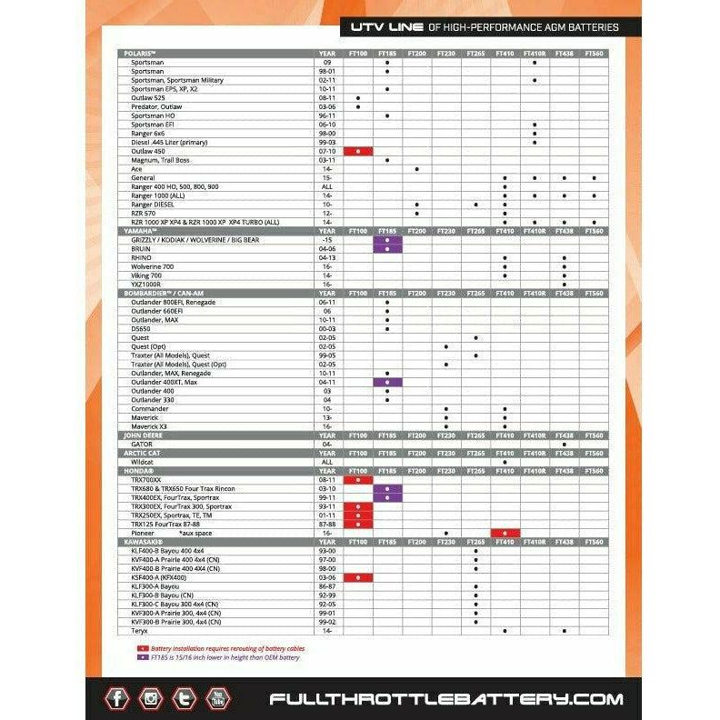 Full Throttle batteries fit the widest variety of vehicle needs and applications (Cars, trucks, motorcycles, marine, power sports, emergency responders and semi-trucks). From professional racing to serious vehicle enthusiasts, Full Throttle is the battery of choice. Tough, reliable, and built to last.