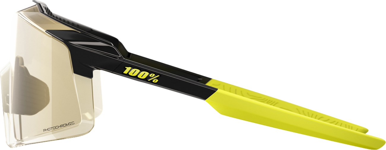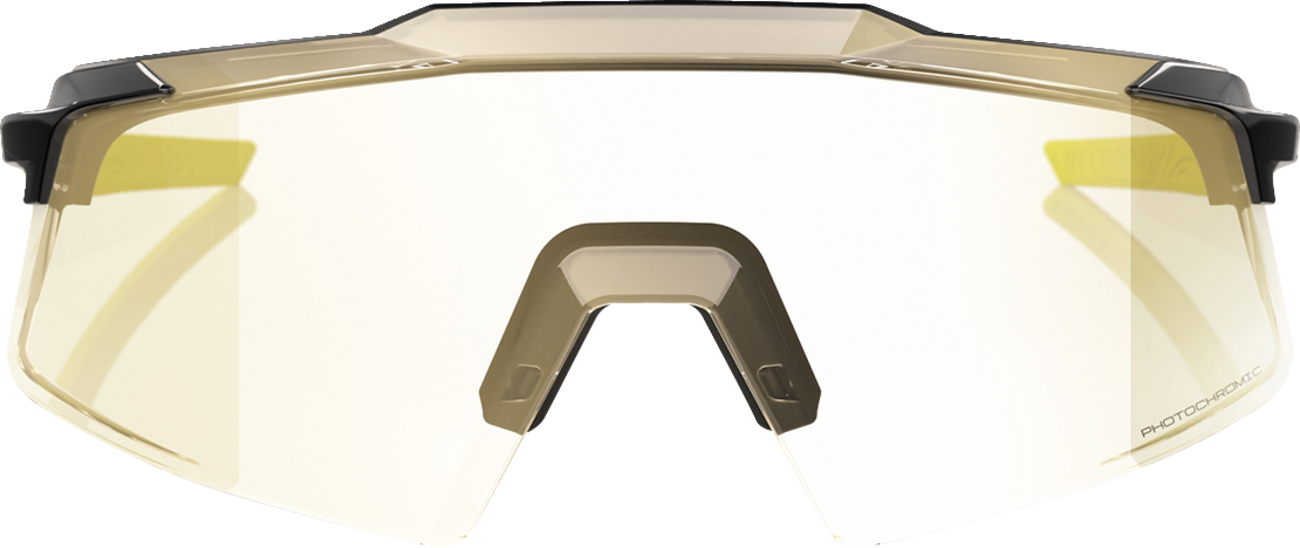 The 100% Aerocraft Sunglasses in Metallic Black feature advanced photochromic lenses that adapt seamlessly to changing light conditions, providing clear vision both indoors and outdoors. Crafted for durability and comfort, these sunglasses are ideal for active lifestyles, including driving, cycling, and outdoor recreation. The lightweight design ensures all-day wear without fatigue, making them a versatile choice for various activities. Designed by 100% for performance and style, these sunglasses combine functional lens technology with a sleek metallic black frame that complements any look. They fit a broad range of face shapes and are suitable for use across multiple vehicle fitments, including cars, motorcycles, and bicycles. Whether you're on the road or on the trail, these sunglasses deliver reliable eye protection and visual clarity.