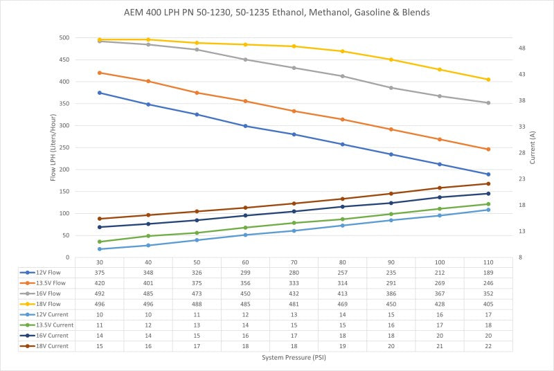 AEM's 400LPH high flow fuel pumps were designed with high performance naturally aspirated and forced induction EFI vehicles in mind! They deliver the same high flow and reliable performance that AEM has become known for at very competitive price. Each pump is individually flow tested and guaranteed to flow 400+ LPH (106 GPH) at 40 PSI (13.5V), which on gasoline will support 1000+ horsepower!* The pumps also maintain their high flowrate even as system pressure increases flowing 330+ LPH at 70 PSI (13.5V) which will support approx. 870 HP* on gasoline! Please see the flow curves and current draw vs. fuel pressure graphs on the specs tab for more information. With their compact 39mm body (same size as Walbro 255), low amperage draw, 11mm inlets and 9mm barbed outlet's these fuel pumps were designed to replace the OEM fuel pump in many applications. The 50-1230 features a double barbed outlet that is ideal for 3/8-inch ID hose where the 50-1235 features a smooth barbed outlet that is compatible with 5/16-inch ID hose. Each pump includes a wiring harness, pre filter, end cap and rubber buffer sleeve.