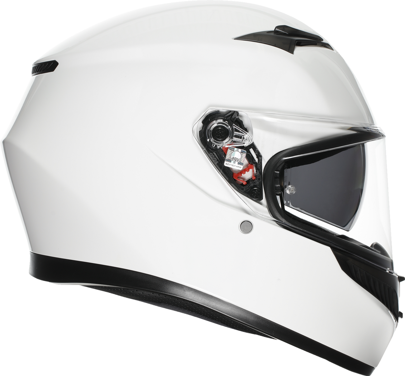 The AGV K3 Helmet Mono in White, size 2XL, offers an optimal combination of safety, comfort, and aerodynamic efficiency for motorcycle enthusiasts. Crafted from high-resistance thermoplastic, this helmet features a shell shape designed to maximize aerodynamic performance and achieve zero dynamic weight at speeds up to 80 mph (130 km/h). The shell is equipped with one rear extractor and four front vents, along with adjustable air vents, to ensure superior airflow and cooling during rides. The interior features 2Dry technology for instant sweat absorption, a removable and washable lining, and a neck roll profile that embraces the rider's neck for added comfort. Its fit is specifically designed to accommodate glasses, making it ideal for riders who require eyewear. The helmet is also ready for a generic communication system, providing seamless integration for communication and entertainment. The AGV K3's visor system includes a Pinlock® 70 MaxVision™ lens, a micro-opening system, and a multistep visor mechanism that offers a 190° horizontal field of view. An anti-scratch coating and an integrated anti-scratch sun visor that can be removed without tools further enhance visibility and safety. This helmet is suitable for a variety of motorcycle models and riding styles, providing both protection and functional features essential for confident riding.