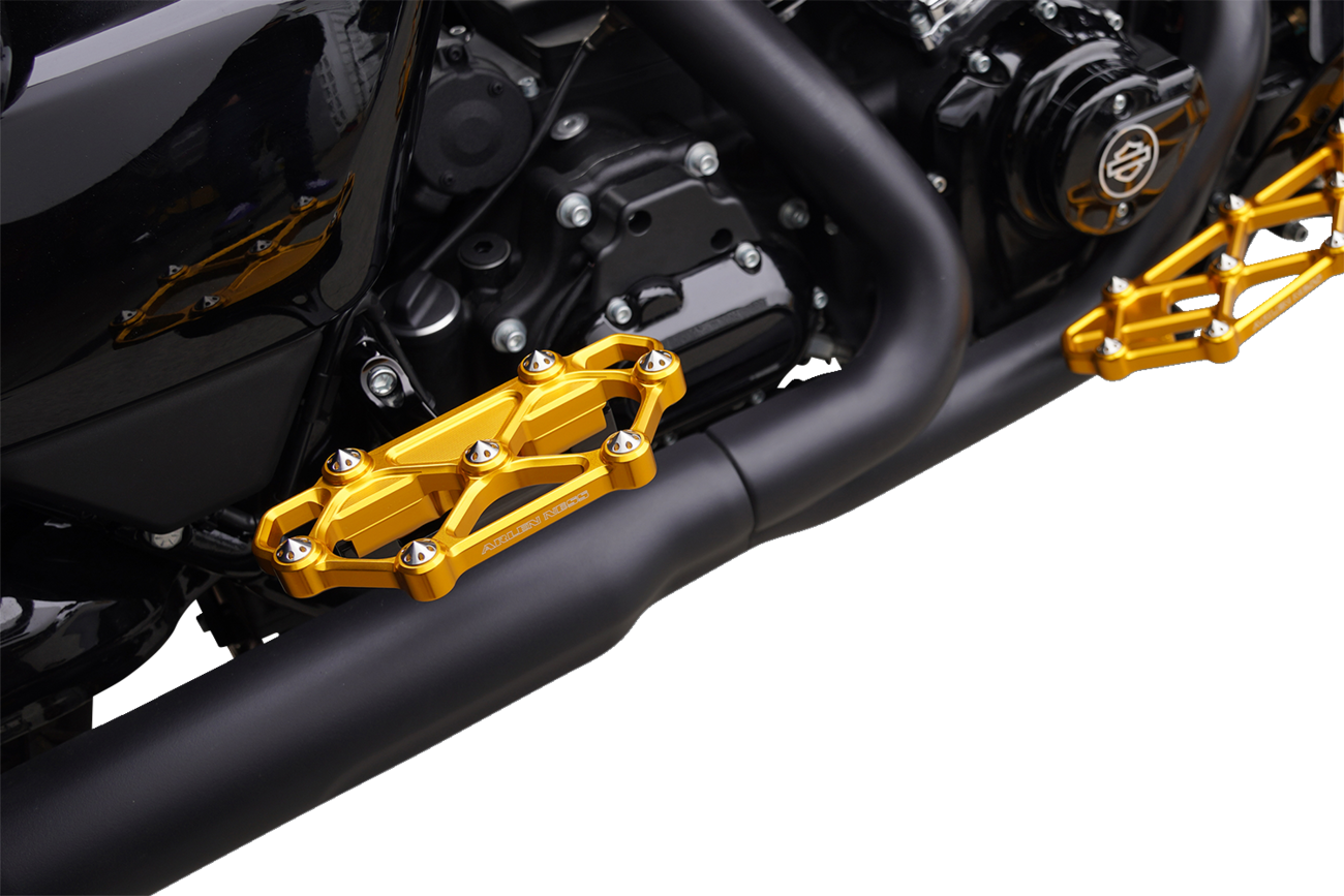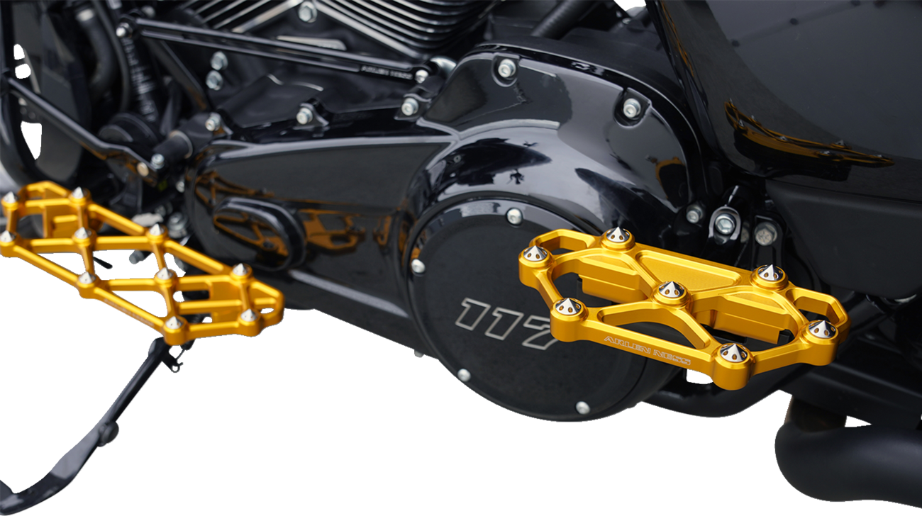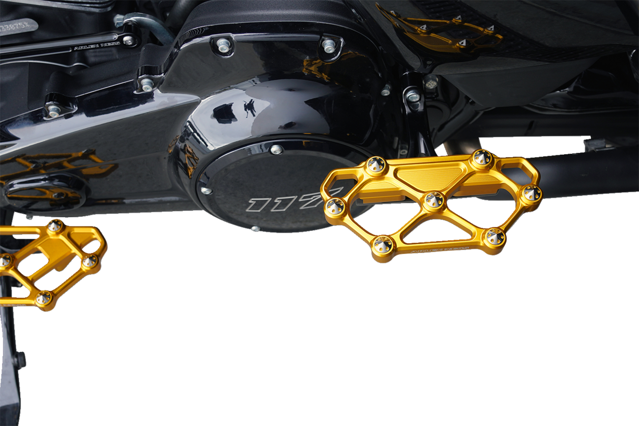 Diamond Floorboards feature an aggressive cut through diamond pattern design with integrated titanium inserts for increased foot traction , Each floorboard body is CNC machined from a solid billet aluminum, Titanium inserts or "spikes" are CNC machined into form and are designed for maximum foot traction , Bolt-on installation , Matching passenger floorboards, mini boards, grips, and footpegs are available separately