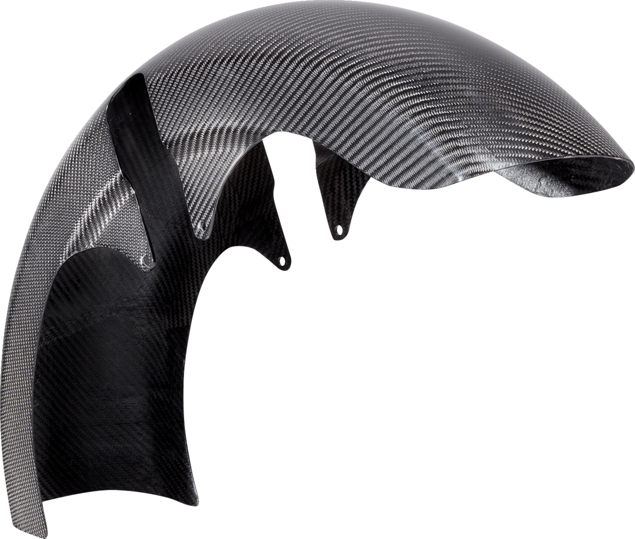 Full-length carbon fiber front fender for 21” x 5.5” fat/wide front wheels, Made from premium pre-preg carbon fiber in CNC machined billet aluminum molds , Each carbon fender features radius bodylines and specially notched sides, 8” wide front fender designed to fit 21” x 5.5” front wheels with 180 mm tires, Allows clearance for up to 14” oversized brake rotors, Direct bolt-on installation, no additional brackets needed