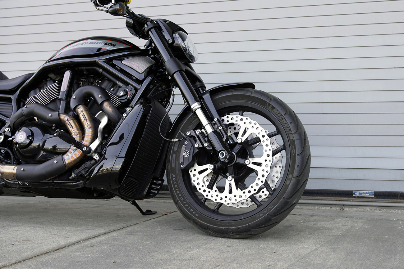 Provides up to 30% more stopping power than factory or factory-sized brake rotors, Upgrades not only performance, but improves the style of your factory wheel, Each floating rotor is constructed from 420 stainless steel, and is drilled for optimum performance and heat dispersion, Billet brake caliper adapters are included in each kit to properly relocate factory caliper to the proper position, Utilizes factory brake caliper, rotor hardware and brake hose, Easy bolt-on installation; no need to re-bleed the brake system, Easy kit includes a floating rotor, brake caliper adapter bracket and necessary chrome hardware, Designed to work with factory fork legs. 15" kits will not work with Arlen Ness "Hot Legs" fork legs.