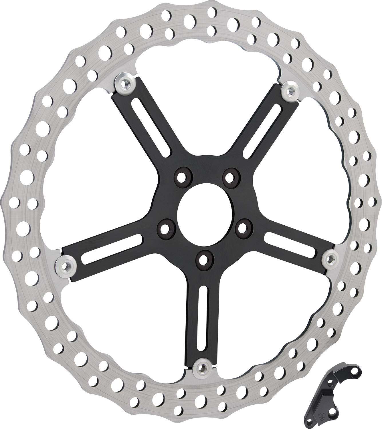 Provides up to 30% more stopping power than factory or factory-sized brake rotors, Upgrades not only performance, but improves the style of your factory wheel, Each floating rotor is constructed from 420 stainless steel, and is drilled for optimum performance and heat dispersion, Billet brake caliper adapters are included in each kit to properly relocate factory caliper to the proper position, Utilizes factory brake caliper, rotor hardware and brake hose, Easy bolt-on installation; no need to re-bleed the brake system, Easy kit includes a floating rotor, brake caliper adapter bracket and necessary chrome hardware, Designed to work with factory fork legs. 15" kits will not work with Arlen Ness "Hot Legs" fork legs.