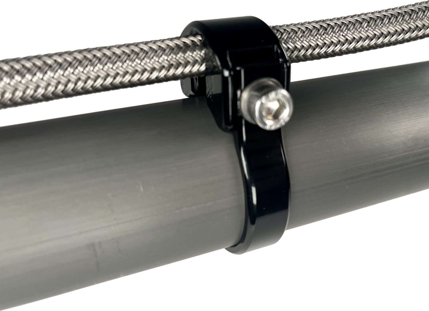 The AXIA MODCLR-BK Tubing Mounted Cable and Line Clamp is designed to securely fasten brake lines, cables, electrical wires, and hydraulic hoses in automotive applications. This clamp is ideal for holding industry-standard 3/8 inch (10mm) diameter rubber or stainless braided brake lines, but it also accommodates many smaller hoses and cables. Its durable construction ensures that lines are held parallel to the mounting tube with approximately 0.300 inches of clearance, preventing chafing and ensuring safe routing. Suitable for a wide range of vehicles including trucks, SUVs, and off-road vehicles, this clamp provides a reliable solution for organized and secure line management in your custom or factory installations. The clamp is sold individually and does not include roll bar mounting clamps, which must be purchased separately. Installation is straightforward, making it suitable for both professional and DIY automotive enthusiasts. Whether you're upgrading your brake lines or managing multiple hoses in your vehicle's engine bay, the AXIA MODCLR-BK clamp offers a dependable and versatile mounting solution that keeps your lines secure and properly routed for optimal performance and safety.
