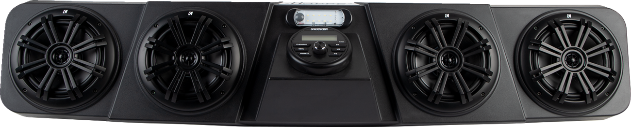 Media Control Center, Kicker ® KMC2 multimedia gauge-style marine receiver with Bluetooth®, AM/FM digital tuner (LED lights may cause signal interference when activated with AM/FM tuner), 200 W peak power, Speakers, 4 Ohm voice coils, 4 Kicker ® 6" KM-Series speakers, 1/2" PEI tweeters, Sealed motor structure, Tuned to sound great while driving/riding, UV-treated polypropylene woofer with Santoprene® Surround, Light Features, Surface-mounted LED dome light, Ultra-bright, high output, 150° light dispersion, Sealed on/off switch, Design Features, Plug-and-Play harnesses with model-matching connectors, Black powder-coated steel mounting brackets, UV stable for a durable attractive finish that lasts for years, Tough impact and temperature resistant injection molded plastic, Rigid design improves sound quality for the cleanest bass and crystal-clear highs, Hoppe liner coating with sealed enclosures for durable, all-weather protection, Compatible with factory roofs