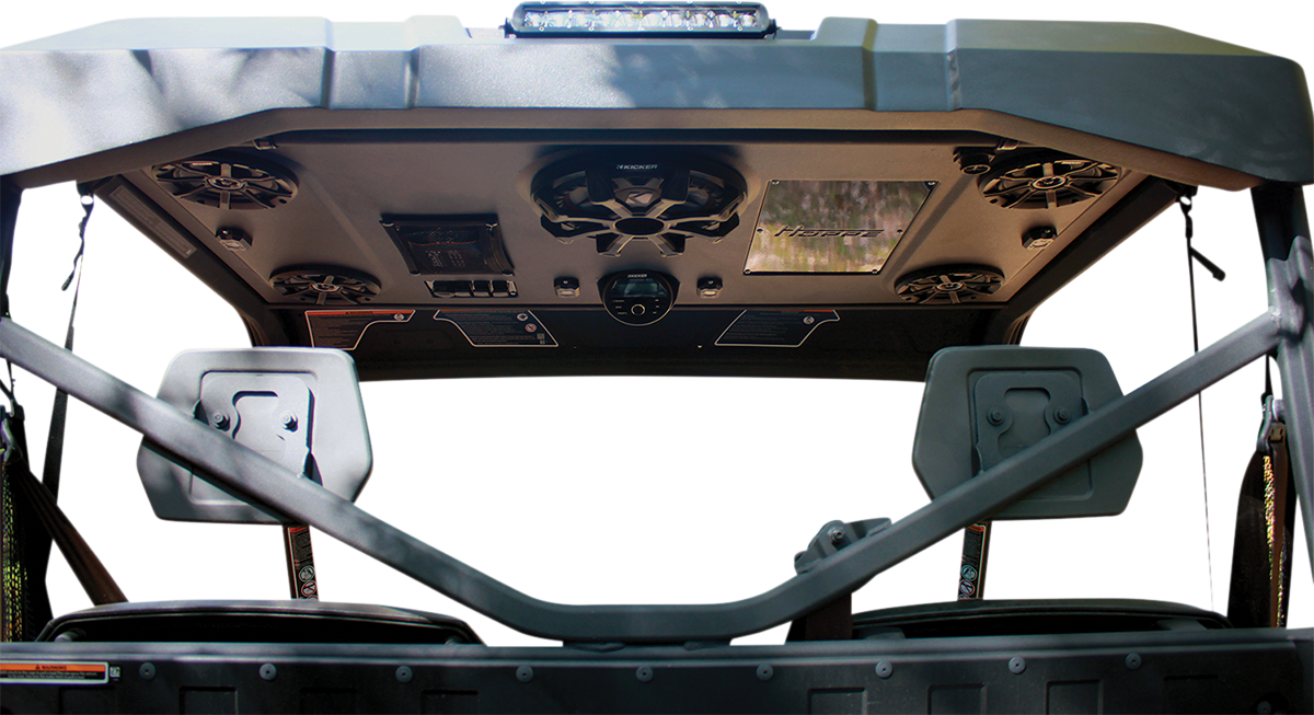 Design Features, Fiberglass composite shell, Infused resin process layered with directional fiber orientation for ultimate rigidity and strength, Rigid design improves sound quality for the cleanest bass and crystal-clear highs, Strengthened edges to protect from tree branch strikes, All cage clamp fasteners hidden on top side for smooth yet aggressive design, Zipper pockets safely secure your phone on the most rugged trails, Hoppe liner coating for durable, all-weather protection, Media Control Center, Kicker® KMC2 multimedia gauge-style marine receiver with Bluetooth®, AM/FM digital tuner (LED lights may cause signal interference when activated with AM/FM tuner), USB input & USB charging, AUX input (headphone jack), Speakers, Kicker® 6-1/2" PS-Series speakers, Titanium tweeters, Waterproof suspension system, Neodymium magnets for high power with low weight, Lightweight, weather resistant polymer baskets, Tuned to sound great while driving/riding, Subwoofer, Kicker® CompRT 10" 400 W, Dual 1 Ohm voice coil, Ultra-thin design, Extra-large surround roll for deeper, smoother bass