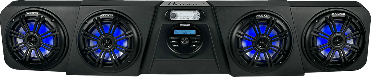 Media Control Center, Kicker ® KMC2 multimedia gauge-style marine receiver with Bluetooth®, AM/FM digital tuner (LED lights may cause signal interference when activated with AM/FM tuner), 200 W peak power, Speakers, 4 Ohm voice coils, 4 Kicker ® 6" KM-Series speakers, 1/2" PEI tweeters, Sealed motor structure, Tuned to sound great while driving/riding, UV-treated polypropylene woofer with Santoprene® Surround, Light Features, Full-spectrum RGB LED 6" speaker package, Surface-mounted LED dome light with 150° light dispersion, Ultra-bright, high output, Sealed on/off switch, Design Features, Plug-and-Play harnesses with model-matching connectors, Black powder-coated steel mounting brackets, UV stable for a durable attractive finish that lasts for years, Tough impact and temperature resistant injection molded plastic, Rigid design improves sound quality for the cleanest bass and crystal-clear highs, Hoppe liner coating with sealed enclosures for durable, all-weather protection, Compatible with factory roofs