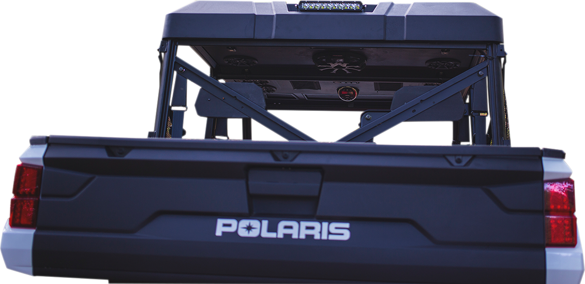 Design Features, Fiberglass composite shell, Infused resin process layered with directional fiber orientation for ultimate rigidity and strength, Rigid design improves sound quality for the cleanest bass and crystal-clear highs, Strengthened edges to protect from tree branch strikes, All cage clamp fasteners hidden on top side for smooth yet aggressive design, Zipper pockets safely secure your phone on the most rugged trails, Hoppe liner coating for durable, all-weather protection, Media Control Center, Kicker® KMC2 multimedia gauge-style marine receiver with Bluetooth®, AM/FM digital tuner (LED lights may cause signal interference when activated with AM/FM tuner), USB input & USB charging, AUX input (headphone jack), Speakers, Kicker® 6-1/2" PS-Series speakers, Titanium tweeters, Waterproof suspension system, Neodymium magnets for high power with low weight, Lightweight, weather resistant polymer baskets, Tuned to sound great while driving/riding, Subwoofer, Kicker® CompRT 10" 400 W, Dual 1 Ohm voice coil, Ultra-thin design, Extra-large surround roll for deeper, smoother bass