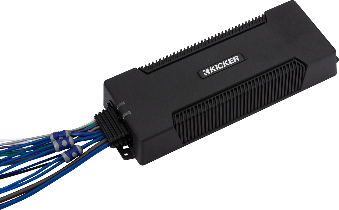 The KICKER 48PXA10005 marine amplifier is designed for demanding audio applications in boats, off-road vehicles, and other outdoor environments. Featuring a waterproof design with IP66 and IP67 ratings, it is fully submersible up to 1 meter for 30 minutes, ensuring reliable operation in wet conditions. This 5-channel amplifier provides 4 channels at 100 W each for full-range sound and a dedicated 600 W sub channel for powerful bass, making it ideal for a versatile sound system. Its high-efficiency Class-D technology delivers a combined rated dynamic power of 1400 W, providing substantial audio output from a compact footprint. The amplifier includes inline power and ground couplers that eliminate the need for soldering or crimping, simplifying installation. Dual turn-on modes, selectable via DC offset or 12 V trigger, provide flexible integration options for different vehicle systems. Stainless-steel mounting hardware is included to ensure secure installation in marine or off-road environments. Compatible with a wide range of vehicles including boats, ATVs, UTVs, and trucks, the KICKER 48PXA10005 is built to withstand harsh conditions while delivering premium audio performance. Whether you need to enhance your marine sound system or upgrade your off-road vehicle audio, this amplifier is engineered for durability and high-quality sound reproduction.