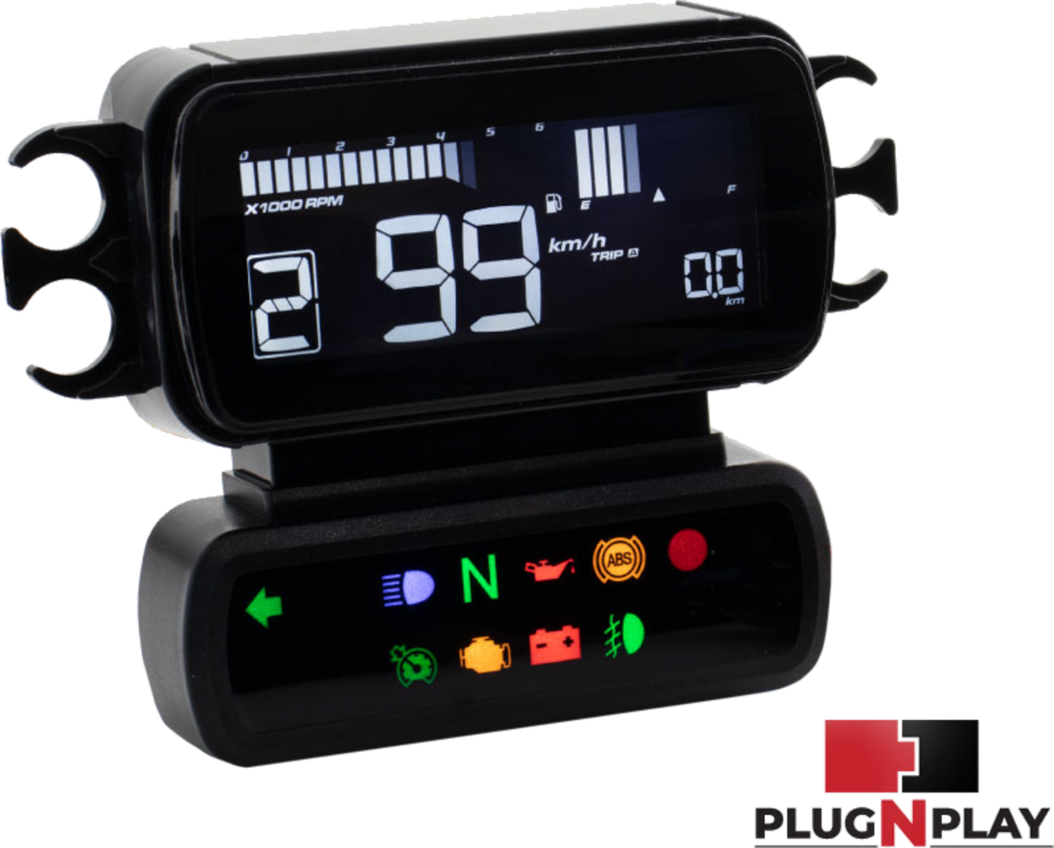 - Displays engine temperature, battery voltage, tire pressure, and system indicator lights