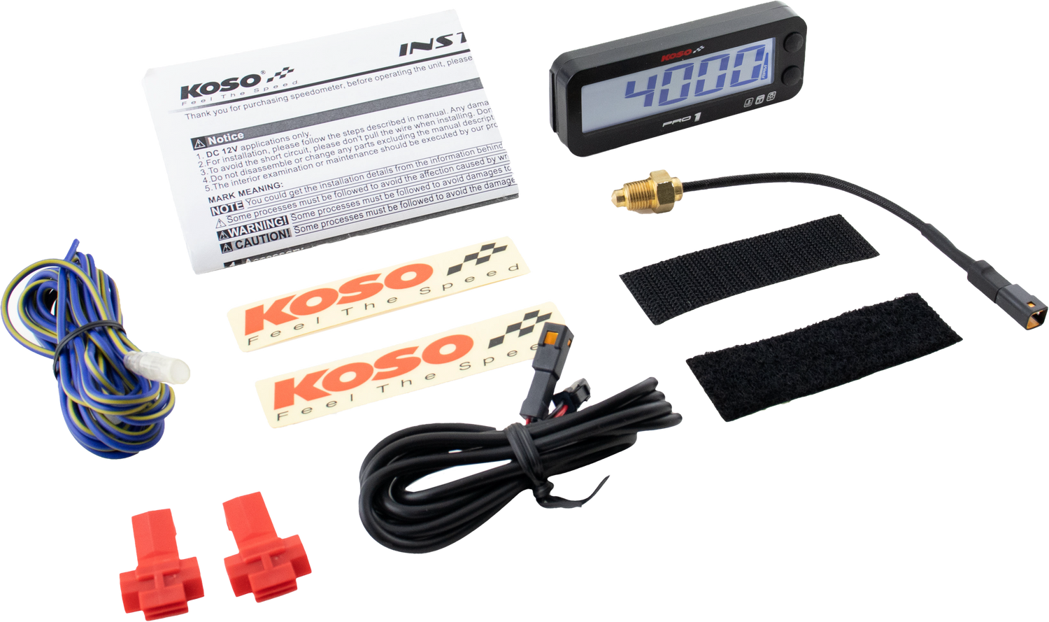 The KOSO Pro 1 RPM and Temperature Meter (Part Number: BA054000) is a versatile instrument designed for a wide range of vehicles including ATVs, motorcycles, and personal watercraft. This compact device provides essential real-time data such as engine RPM, temperature, voltage, and shift alerts, helping you monitor your vehicle's performance effectively. Its sleek design integrates seamlessly into your vehicle’s dashboard, offering both durability and ease of use. The unit features a wide, bright backlit screen that ensures visibility in all lighting conditions, making it suitable for day or night riding. With built-in warning indicators for RPM and temperature, it alerts you promptly to potential issues, promoting safer operation. The tachometer, hour meter, thermometer, volt meter, and shift light functionalities make this meter a comprehensive tool for enthusiasts and professionals alike. Whether you’re tuning your engine or keeping an eye on critical parameters, the KOSO Pro 1 helps optimize performance and prevent damage. This product is suitable for various vehicle models, including ATVs, motorcycles, and personal watercraft, ensuring compatibility across different makes and models. Easy to install and built to withstand harsh conditions, the KOSO Pro 1 RPM and Temperature Meter is a reliable addition to your vehicle’s instrumentation setup.