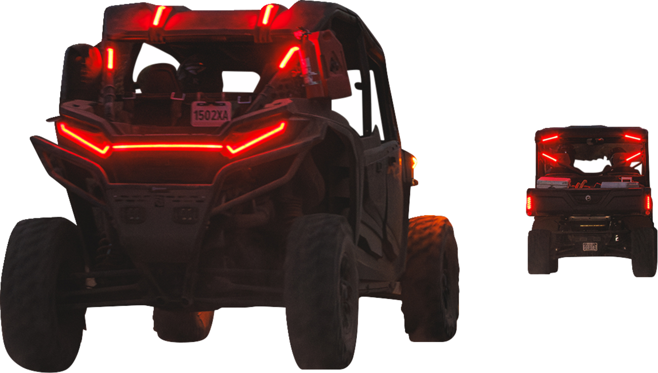Customized with next-generation diffused LEDs, Pulsates four times when braking, delivering 300% brighter light than OEM brake lights, Runs 5x brighter than stock taillights, Can add up to four sets (eight lights total), IP67-rated with heavy-duty polycarbonate lenses, aluminum heat-sink frames, and waterproof wiring, Includes roll cage mounting adapter plate, brake light flash modulator and Plug-and-Play harness, Fully Plug-and-Play installation in under 30 minutes, Mounts to any flat surface or 1-1/4” - 2-1/2” roll bar, including OEM and aftermarket bumpers.