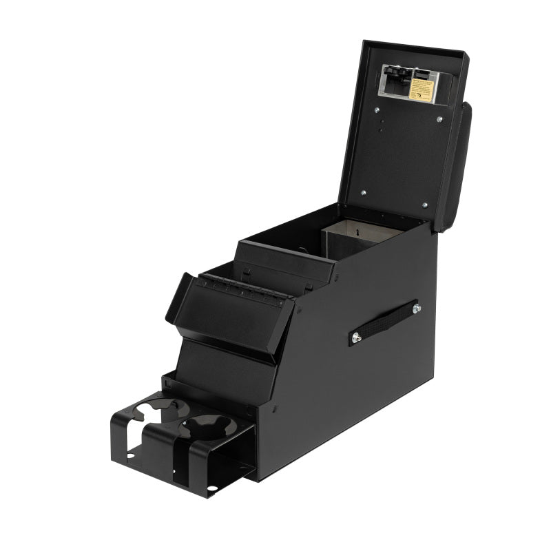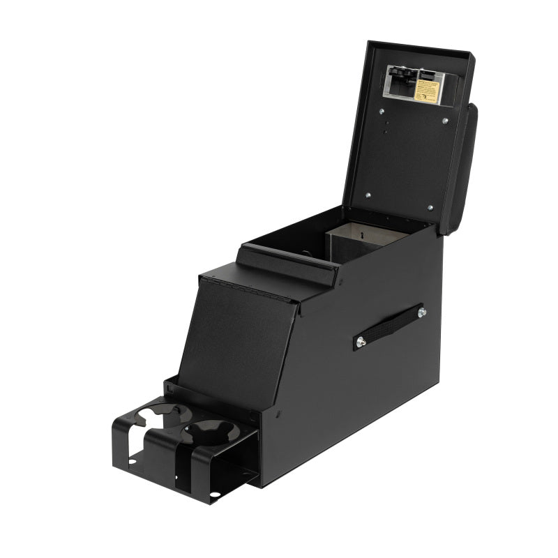 This convenient 8 inch wide steel security console features Tuffy’s patented push-button latch system. For safety and convenience while operating the vehicle, the lid also latches closed without having to be locked. It has 2 compartments, a separate compartment for mounting a stereo, CB Radio, or other electronic equipment, and a lockable rear storage space lined with a rubber floor mat. The spacious rear compartment accommodates a CD changer, tools, and other valuables. Other accessories are also available.