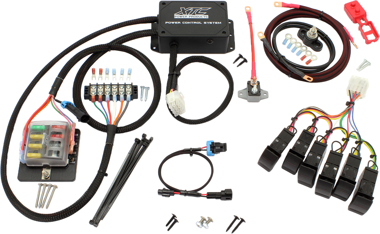 The XTC Power Products PCS-64-YXZ is a versatile and reliable power control system designed specifically for Toyota YXZ models. This system features a 6-switch configuration, allowing you to manage multiple auxiliary lights and accessories with ease. Included is a red LED strobe rocker switch for enhanced visibility and control. The system provides one high-power relayed circuit rated at 30 amps, one at 20 amps, and three direct circuits rated at 10 amps each, giving you the flexibility to power various accessories simultaneously. Additionally, the built-in 2-channel strobe system, each channel rated at 10 amps with its own strobe rocker switch, adds additional lighting options for off-road or work applications. The fuse block ensures each switch has an individual fuse, protecting your electrical components from overloads. An 8-gauge power cable supplies a 50-amp main circuit breaker at the battery connection, ensuring safe power distribution. The screw terminal strip allows for straightforward integration with your vehicle's wiring. Upgrading switches enables bottom row lighting, providing enhanced illumination options. Built in the USA, this plug-and-play system is designed for ease of installation and durability. Suitable for Toyota YXZ vehicles, including models from 2016 and later, this power control system is ideal for off-road enthusiasts and professionals seeking reliable auxiliary power management. Whether for lighting, winches, or other accessories, the PCS-64-YXZ offers a comprehensive solution for vehicle customization and electrical control.